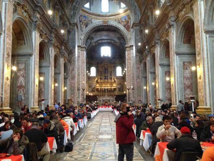 Oggi, nella Basilica dei Santi Severino e Sossio, sono stati oltre 250 i poveri che hanno festeggiato il Natale assieme al cardinale Crescenzio Sepe, arcivescovo di Napoli: anziani soli, senza fissa dimora, disabili, stranieri, famiglie rom, “gente sola – fa sapere la Comunità – che il giorno di Natale ha trovato una famiglia più larga attorno a cui stringersi”. Altri pranzi ci sono stati nel Rione Scampia nella chiesa dei padri Redenzionisti, nel quartiere di Fuorigrotta nella chiesa di S. Antonio Ardia, nel centro antico nelle chiese di Nicola al Nilo, San Gennaro all’Olmo e Santa Maria delle Grazie a Toledo, nel Borgo Vergini nella chiesa di Santa Maria Succurre Miseris, nel Vasto nella chiesa di Sant’Anna e nella cappella della Stazione Centrale. Ancora, nell’istituto Cristo Re e a San Giovanni a Teduccio, ad Aversa nella chiesa di San Domenico. L’invito al pranzo “è stata una buona notizia e ha dato dignità a chi lo ha ricevuto: tutti sono chiamati per nome e ciascuno ha avuto un regalo personalizzato. E’ il segno di un’amicizia che dura tutto l’anno, con tante visite che trasformano le giornate di chi è solo e senza prospettive” si sottolinea ancora. Tanti anche i volontari, oltre 500, che da vari luoghi della Campania hanno partecipato ai pranzi. “Il Natale è una festa che porta luce e illumina i tanti luoghi bui, i tanti luoghi del dolore – spiega Antonio Mattone, portavoce della Comunità di Sant’Egidio – Ma il Natale è anche la festa della generosità, in questi giorni tanti hanno chiesto di rendersi utili esprimendo così il bisogno di fare qualcosa per gli altri. Fino a ieri sera hanno scritto alla Comunità per partecipare e si sono aggregati all’ultimo momento. E allora questa tavolata di tanti soli e senza famiglia insieme con gente di buona volontà, vuole essere quella luce che dà gioia e speranza a esistenze segnate dalla povertà e dalla sofferenza. Il segno di una città più umana che non lascia indietro nessuno”.