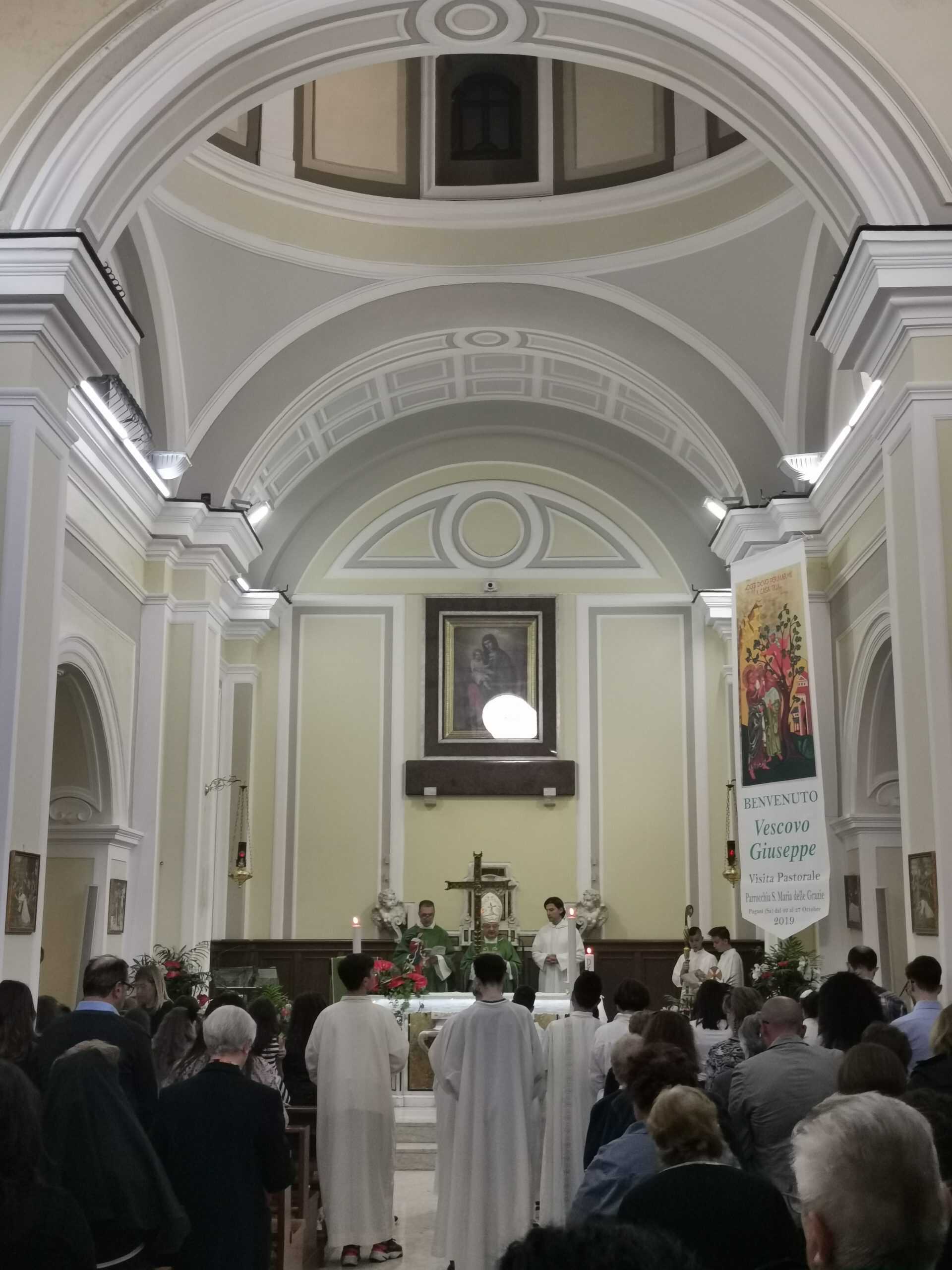 Si è conclusa domenica 27 ottobre la visita pastorale di mons. Giuseppe Giudice alla città di Pagani. Numerosa è stata l’affluenza di persone che ha preso parte alla Santa Messa delle ore 11 nella chiesa di Santa Maria delle Grazie. Emozionante e significativa l’omelia di mons. Giuseppe Giudice che si è conclusa con i ringraziamenti e il dono, da parte di padre Giuseppe, della Madonna che scioglie i nodi perché – come afferma lo stesso sacerdote nei confronti del vescovo- “voi siete la persona giusta che in questa visita pastorale ci può aiutare di più a farlo” e continua -” proprio come ci avete insegnato la Chiesa respira con due polmoni: la chiesa di appartenenza, Santa Maria delle Grazie e la Diocesi, ovvero la Chiesa universale del Signore” conclude. Replica il vescovo “I nodi da sciogliere si sono tanti però abbiamo con il Figlio della carità, della speranza il compito di CREDERCI (…) Poiché è l’Eucarestia il centro dalla quale partiamo e dalla quale ritorniamo come missionari e testimoni della Fede”.