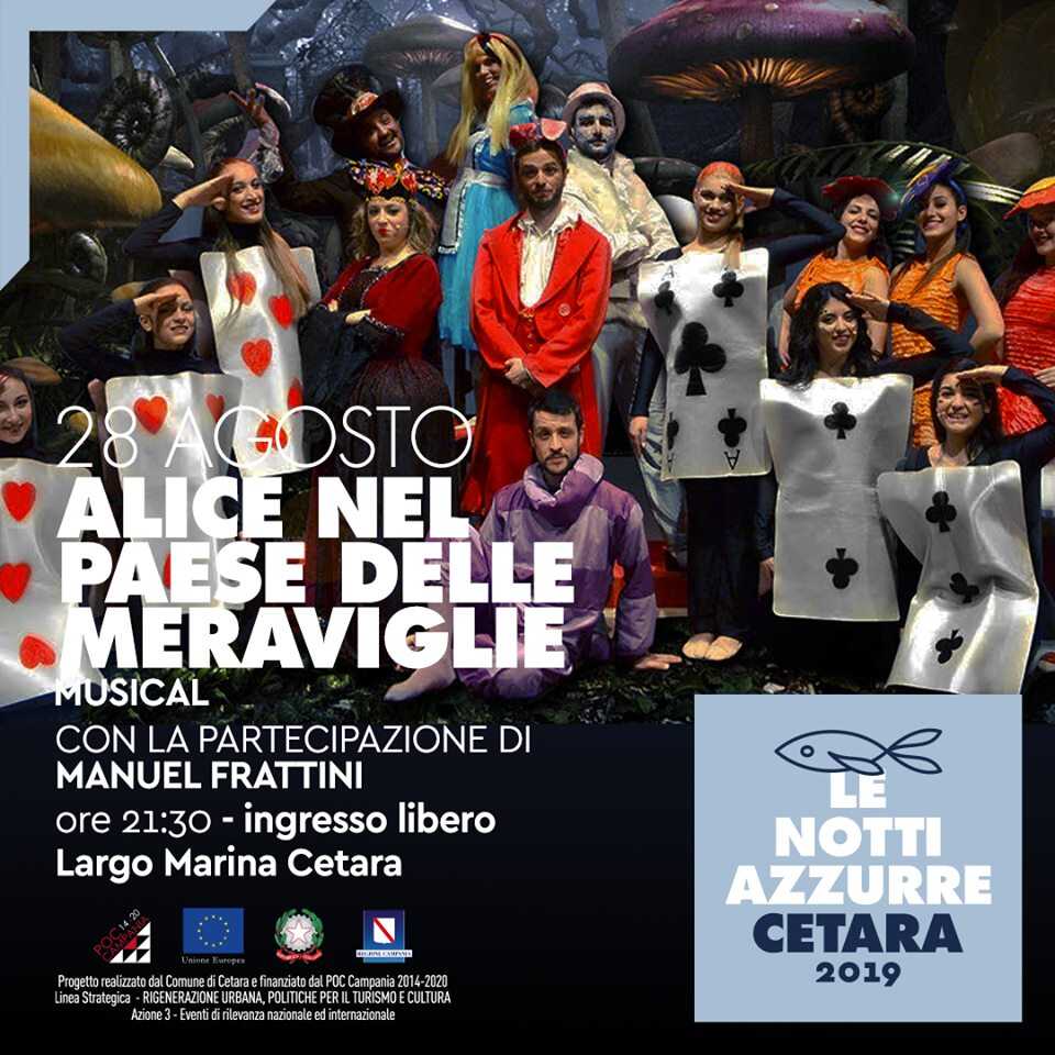 Scritto e diretto da Gaetano Stella con le musiche originali di Guido Cataldo, il musical si arricchisce della partecipazione del “Professional Ballet” di Pina Testa. Ai personaggi più noti, si affiancherà l’Incantastorie, Manuel Frattini, il noto attore/ballerino, che affascinerà la giovane protagonista del viaggio con una storia simpaticamente intrigante che vede protagonista un’altra “alice”… una principessa del mare che il suo “Paese delle Meraviglie” l’ha trovato in una magica conca della Costiera Amalfitana. Cetara? Probabilmente sì.