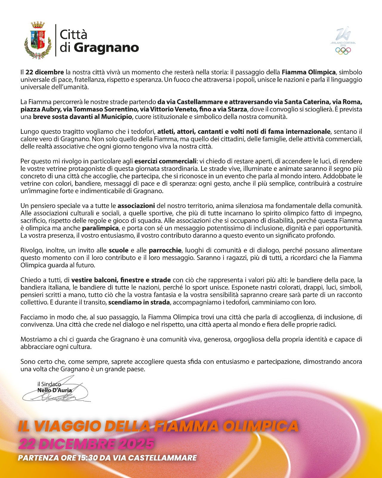 “Il 22 dicembre la nostra città vivrà un momento che resterà nella storia: il passaggio della Fiamma Olimpica, simbolo universale di pace, fratellanza, rispetto e speranza. Un fuoco che attraversa i popoli, unisce le nazioni e parla il linguaggio universale dell’umanità.