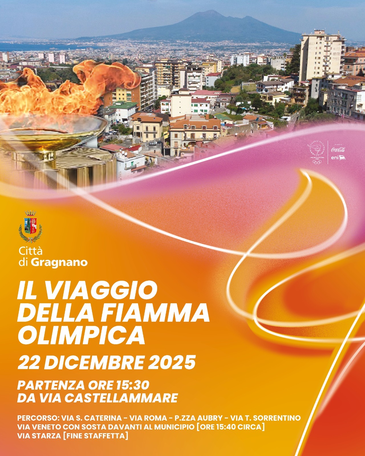 Lungo questo tragitto vogliamo che i tedofori, atleti, attori, cantanti e volti noti di fama internazionale, sentano il calore vero di Gragnano. Non solo quello della Fiamma, ma quello dei cittadini, delle famiglie, delle attività commerciali, delle realtà associative che ogni giorno tengono viva la nostra città.