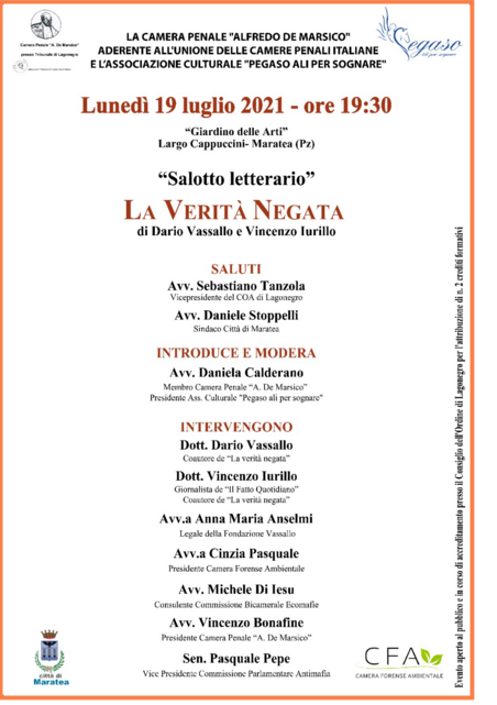 Questa sera alle ore 19.30 la Camera Penale “Alfredo De Marsico”, presso il Tribunale di Lagonegro, e l’Associazione culturale “Pegaso-Ali per sognare”, con il patrocinio del Comune di Maratea e della Camera Forense Ambientale, presentano il libro “la Verità Negata”, di Dario Vassallo e Vincenzo Iurillo, edito da Paper First, in Maratea, presso il Giardino delle arti, Convento dei Cappuccini. Tutto comincia il 5 settembre del 2010, quando nove colpi di pistola raggiungono l’auto di Angelo Vassallo, sindaco di Pollica. Un uomo colto e di umili origini, che aveva saputo trasformare un piccolo comune della Campania, logorato dagli interessi della malavita locale, in un esempio di civiltà per il mondo, tanto da meritare il riconoscimento della delegazione italiana in Kenya. Come spesso accade, chi persegue la giustizia viene lasciato solo, diventando un facile bersaglio della criminalità organizzata.