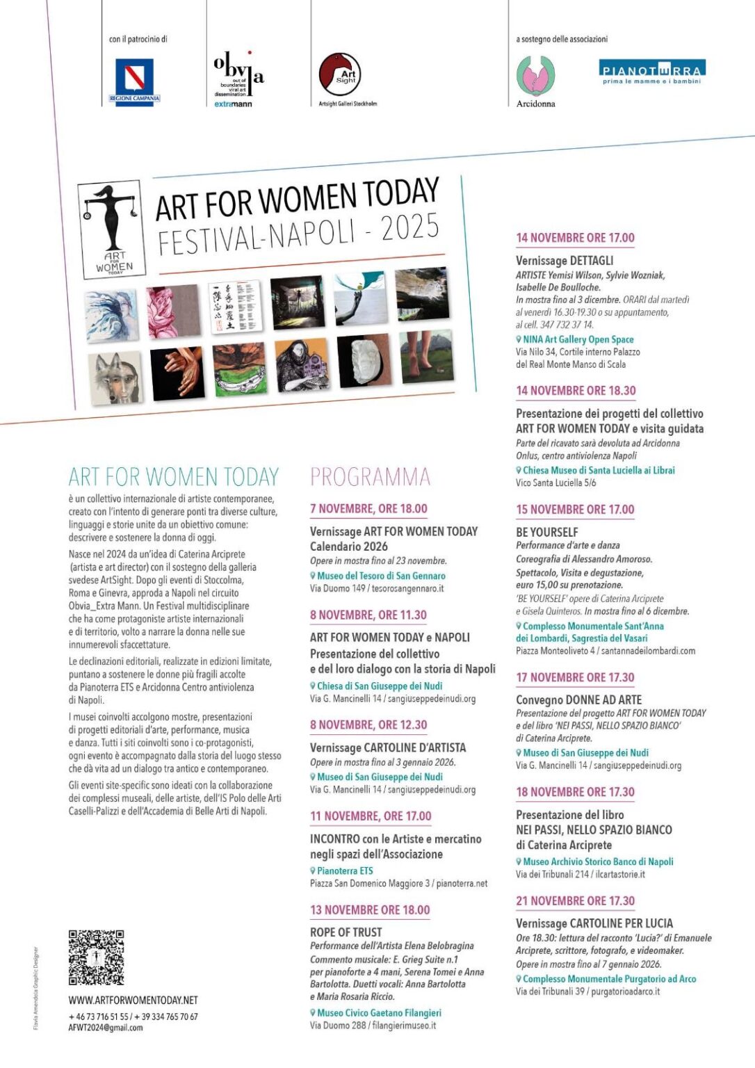 Dal 7 al 21 novembre Napoli si trasforma in un palcoscenico diffuso dedicato all’arte e alla figura femminile. Arriva in città “ART FOR WOMEN TODAY”, il Festival Internazionale del Collettivo di artiste contemporanee ideato da Caterina Arciprete con il sostegno della galleria svedese ArtSight, dopo le tappe di Stoccolma, Roma e Ginevra.