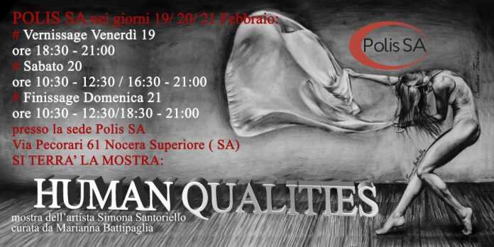 Venerdì 19 febbraio prossimo – alle ore 18.30 presso la sede di Polis Sviluppo ed Azione in via Pecorari, 61 a Nocera Superiore – partirà la mostra “HUMAN QUALITIES” di Simona Santoriello, curata da Marianna Battipaglia.