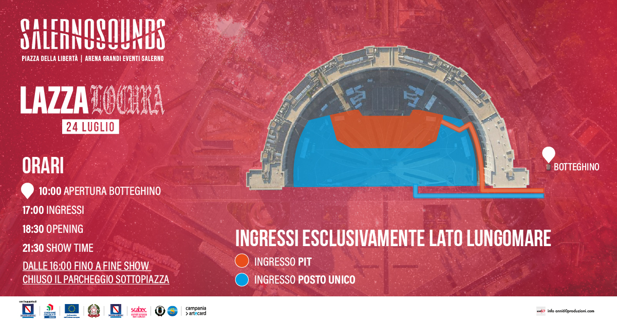 L’artista dei record fa tappa all’Arena Grandi Eventi con il LOCURA SUMMER TOUR 2025 che lo vede protagonista di un’estate a tutto live a coronamento di un anno straordinario all’insegna dei concerti, iniziato a gennaio con le 11 tappe da tutto esaurito nei palazzetti italiani (tra cui il PalaSele di Eboli) dove Lazza ha portato per la prima volta dal vivo l’ultimo album LOCURA, certificato Quadruplo Disco di Platino, e proseguito poi ad aprile nei club delle principali città europee, dove ha conquistato nuovi palchi internazionali esportando la sua “locura”.Mesi densi di appuntamenti live che lo hanno traghettato, mercoledì 9 luglio, sul palco dello Stadio San Siro, per la prima volta nella Scala del Calcio: un nuovo imponente passo nella sua carriera, la definitiva consacrazione nell’Olimpo della musica live italiana.Prodotto daVivo Concerti, il LOCURA SUMMER TOUR 2025 è l’occasione perfetta per lasciarsi travolgere dall’energia che Lazza sprigiona on stage, con una setlist pensata per ripercorrere con il pubblico la storia in musica dell’artista del roster Me Next: un percorso che ad oggi gli è valso oltre 6 miliardi di stream complessivi, e 1 Disco di Diamante, 106 Dischi di Platino e 49 Dischi d’Oro nel palmarès.