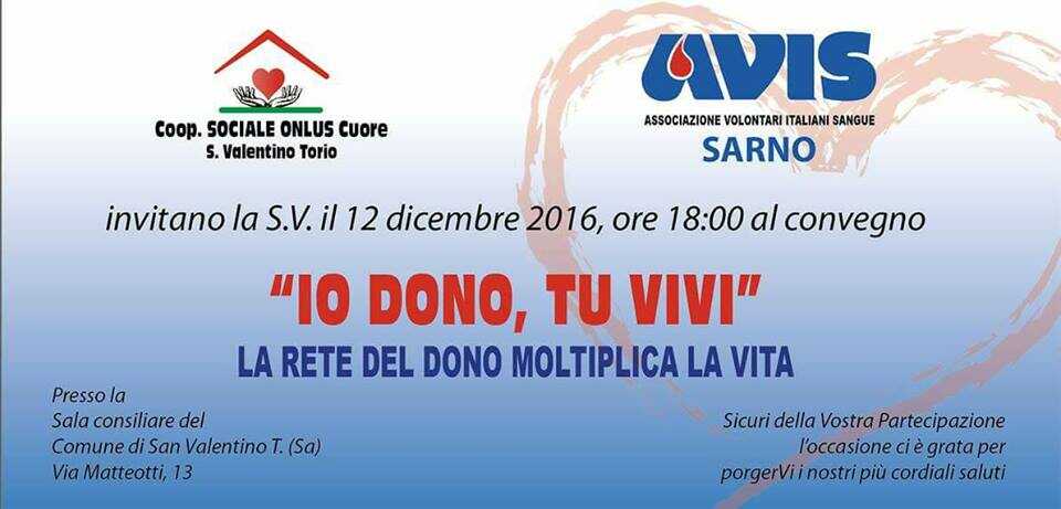 “La sinergia tra istituzioni, volontariato ed associazioni è un punto fondamentale per accrescere la cultura della donazione che altro non è che amore per il prossimo – ha sostenuto il sindaco Strianese – ma bisogna fare subito dei gesti concreti. Infatti sabato mattina dalle 8 alle 12 si potrà donare il sangue al piano terra del Palazzo Comunale di San Valentino Torio, grazie alla Cooperativa Cuore ed all’AVIS di Sarno”.