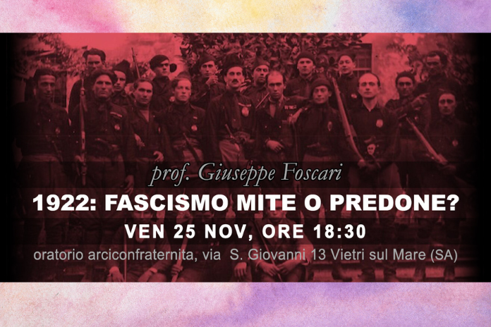Giro di boa per la IX edizione degli incontri di cultura dell’associazione culturale vietrese “La Congrega Letteraria”: dopo l’intenso finesettimana con Pasolini, la premiazione del concorso di poesia per studenti “Poesis – Vietri sul Mare”, e la lezione della grecista prof.ssa Eva Cantarella presso l’aula consiliare del Comune, il prof. Giuseppe Foscari, professore associato presso il Dipartimento di Studi Politici e Sociali – Disps dell’Università degli studi di Salerno, terrà la lectio magistralis “1922: FASCISMO MITE O FASCISMO PREDONE?”.