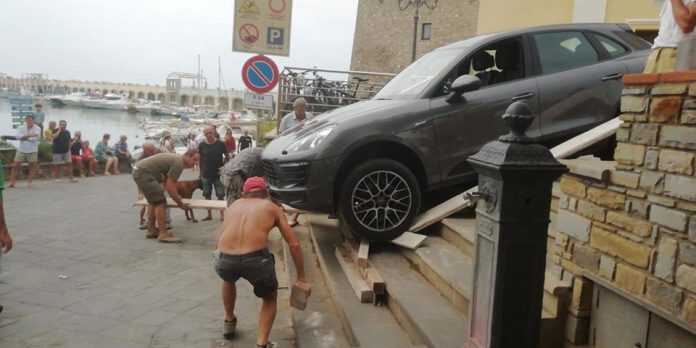 Una manovra errata ed un Suv Porsche si ritrova sulle scalinate adiacenti la chiesa di Acciaroli.  Un turista alla guida della sua vettura ha sbagliato direzione e si è trovato a scendere le scale con la sua auto rimanendo però bloccato.