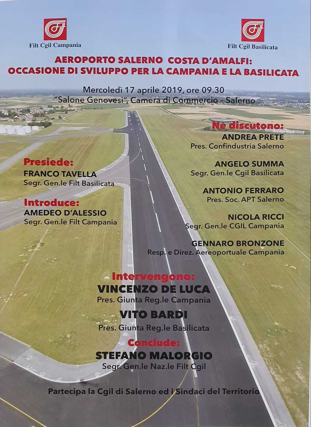 Il presente e il futuro dell’Aeroporto “Salerno-Costa d’Amalfi”, il ruolo in Campania, gli scenari di collaborazione con la Basilicata saranno al centro del convegno promosso dalla Filt Cgil Campania e dalla Filt Cgil Basilicata dal titolo “Aeroporto Salerno Costa d’Amalfi, occasione di svilupppo per Campania e Basilicata” che si terrà mercoledì 17 aprile alle ore 9:30 nel salone “Antonio Genovesi” della Camera di Commercio di Salerno (via Roma). Presiede Franco Tavella, segretario generale Filt Cgil Basilicata. Introduce, Amedeo D’Alessio, segretario generale Filt Cgil Campania. Ne discutono Andrea Prete, presidente Confindustria Salerno, Angelo Summa, segretario generale Cgil Basilicata, Antonio Ferraro, presidente società “Aeroporto Salerno-Costa d’Amalfi”, Nicola Ricci, segretario generale Cgil Campania, Gennaro Bronzone, responsabile direzione aeroportuale Campania. Intervengono Vincenzo De Luca, presidente Regione Campania, Vito Bardi, presidente Regione Basilicata e Stefano Malorgio, segretario generale Filt Cgil Nazionale.