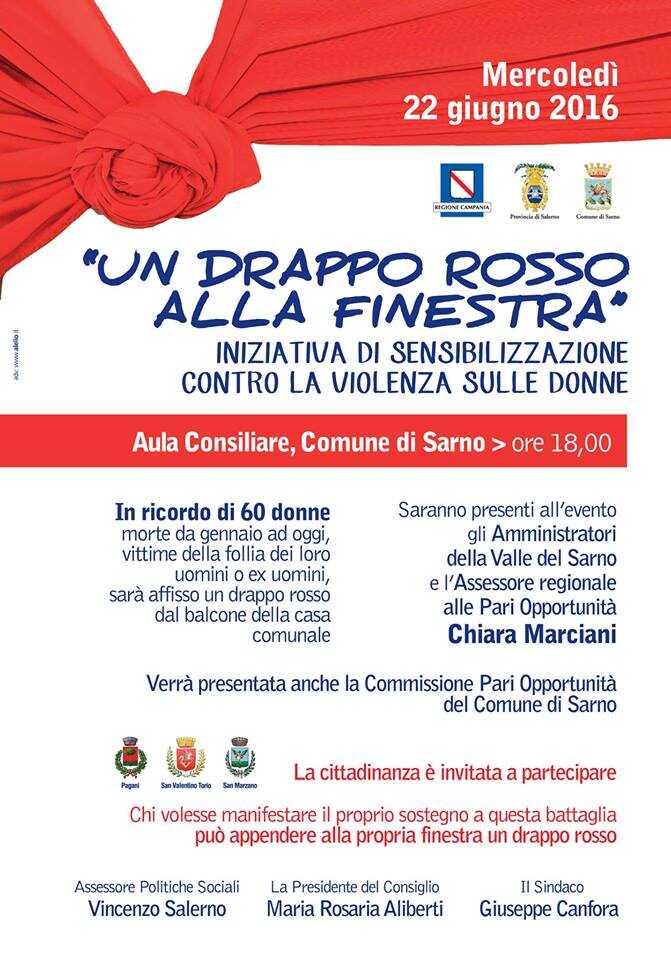“Un drappo rosso alla finestra” è l’niziativa di sensibilizzazione contro la violenza sulle donne. In ricordo delle 60 donne morte da gennaio ad oggi, vittime della follia dei loro uomini o ex uomini, sarà affisso un drappo rosso dal balcone della casa comunale di Sarno.