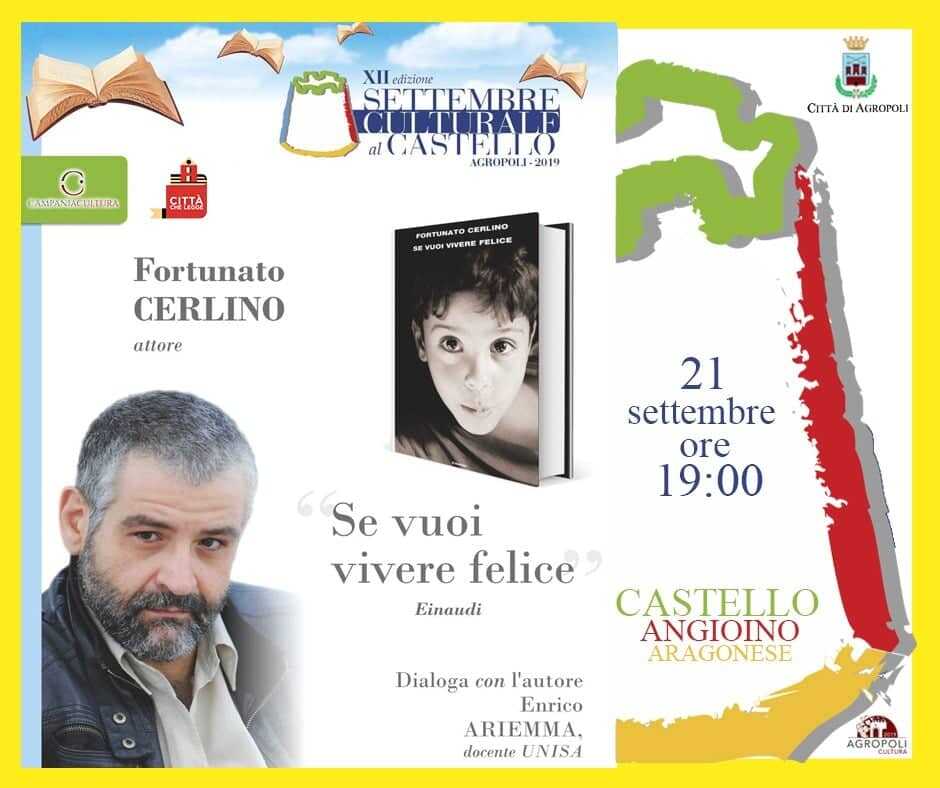 Un successo sempre crescente quello del Settembre Culturale, rassegna letteraria organizzata e promossa dall’Amministrazione comunale, retta dal sindaco Adamo Coppola, giunta quest’anno alla XII edizione. Un cartellone di ampio respiro quello preparato dal consigliere delegato alla Cultura nonché ideatore della rassegna, Franco Crispino. Gli appuntamenti, finora molto seguiti, riserveranno nei prossimi giorni ancora tante emozioni e curiosità agli affezionati ospiti. Attesissimo l’appuntamento di sabato 21 settembre, a partire dalle ore 19, quando ci sarà un ospite d’eccezione. Stiamo parlando di Fortunato Cerlino, il don Pietro Savastano della fortunata serie televisiva “Gomorra”. L’attore partenopeo, al suo esordio come scrittore presenterà ad Agropoli il suo romanzo “Se vuoi vivere felice”. Il protagonista del romanzo, in parte autobiografico, è Fortunato, un bambino che abita nella periferia di Napoli e coltiva molti sogni. Da bambino, l’autore aveva un quaderno sul quale annotava tutte le esperienze che viveva nel quotidiano. Ebbene quei ricordi sono diventati il suo primo romanzo. In riferimento al titolo “Se vuoi vivere felice”, l’autore evidenzia: «è un consiglio quello presente nel testo, non una ricetta della felicità. Penso che esista un rapporto diretto tra sogno e felicità, che è fatta di istanti».