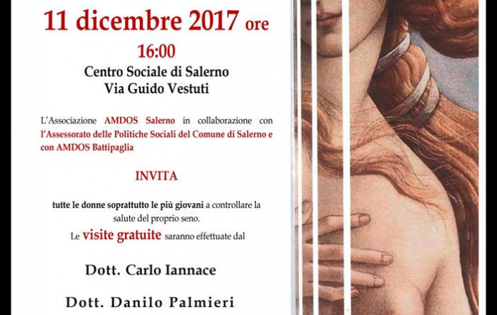Lunedì 11 dicembre, a partire dalle ore 16, l’associazione AMDOS Salerno, in collaborazione con l’assessorato alle Politiche Sociali del Comune di Salerno e con AMDOS Battipaglia, ha organizzato controlli senologici per le signore e le giovani donne che intendono effettuare una visita. L’invito è rivolto a tutte le donne, soprattutto le più giovani, a controllare la salute del proprio seno. Le visite, gratuite, saranno effettuate dal dottor Carlo Iannace e dal dott. Danilo Palmieri – Chirurghi dedicati alla Senologia c/o ospedale Moscati di Avellino. Portare con sé la carta d’identità e gli ultimi esami eseguiti.