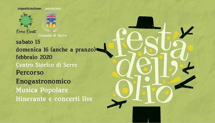 Il 15 e 16 febbraio 2020, nel Centro Storico di Serre andrà in scena la terza Edizione della Festa dell’olio. Nella due giorni si potrà degustare un ricco menù composto da piatti tipici impreziositi dal principe della tradizione culinaria Italiana, l’olio di oliva.