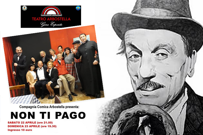 Appuntamento fuori cartellone al Teatro Arbostella Gino Esposito, con il cartellone che riprenderà a fine mese. Si terrà infatti sabato 22 e domenica 23 aprile uno dei classici della commedia partenopea ovvero “Non ti Pago” celebre testo in 3 atti di Eduardo De Filippo, proposta dalla compagnia “Comica Arbostella” con la regia di Francesca Musa.
