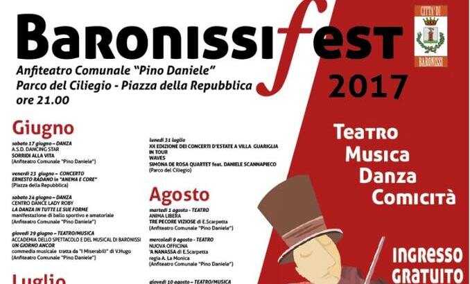 Grande attesa a Baronissi per il “BaronissiFest 2017″. Dal 17 giugno al 31 agosto ventisei spettacoli di teatro, cabaret, musica, danza con eventi ed artisti di primissimo piano animeranno la città del sindaco Valiante. La direzione artistica del ” BaronissiFest”, giunto alla terza edizione, è affidata all’Accademia dell’Arte e dello Spettacolo di Baronissi. Una rassegna culturale di grande qualità che saprà richiamare, come gli scorsi anni, migliaia di spettatori. L’evento è stato organizzato dal Comune di Baronissi.