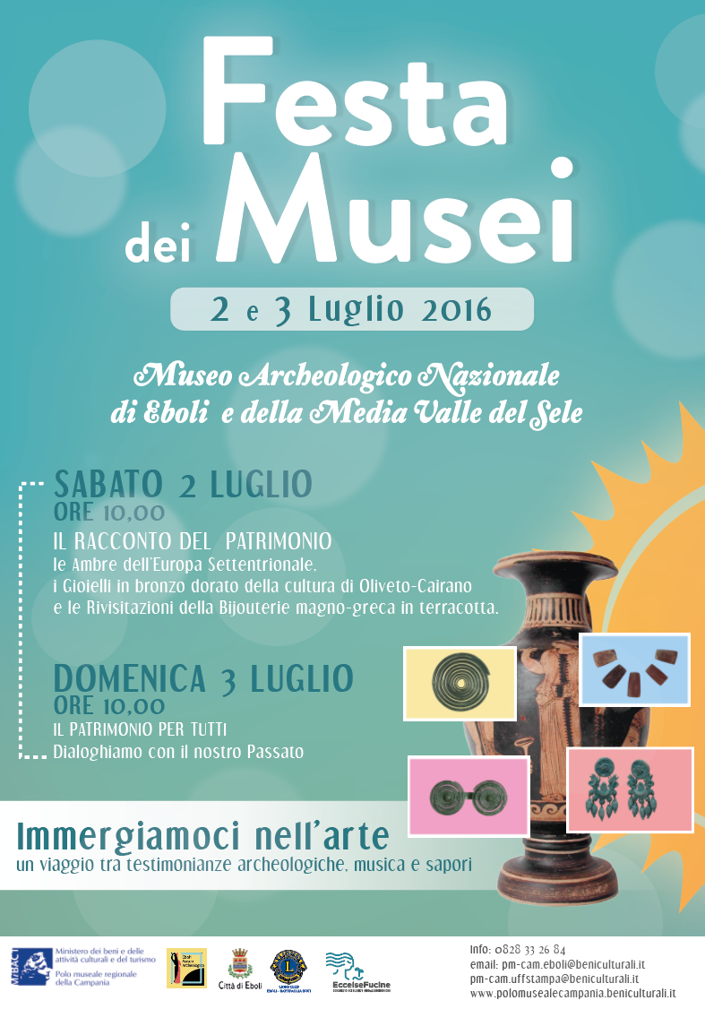 Domenica 3 luglio ore 10.00: “Il Patrimonio per e di tutti”, invito a dialogare insieme. Parliamo a tutti della nostra Storia, rendiamo visibile il filo apparentemente invisibile che unisce Passato, Presente e Futuro, nel pieno rispetto delle diverse Culture, delle quali il Museo è piena testimonianza. Saranno presenti giovanissimi musicisti con l’armonia ed il ritmo delle note della chitarra (Elisa Bottiglieri) e del violino (Alessandro Cariello). Per i saluti interverranno il sindaco di Eboli, Massimo Cariello, e l’assessore Matilde Saja.