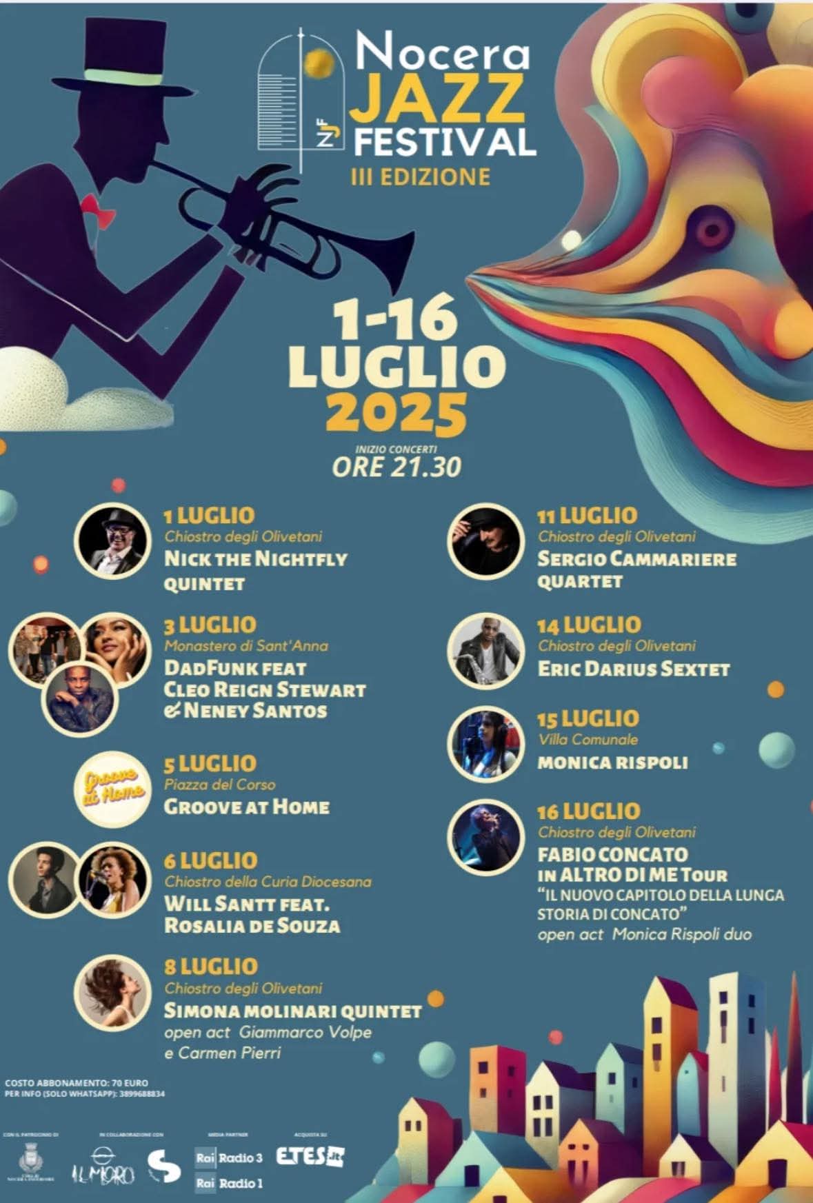 Il biglietto per la serata inaugurale ha un costo simbolico di 10 euro. Per ulteriori informazioni sul programma completo e l’acquisto dei biglietti, è possibile consultare il sito ufficiale: www.nocerajazzfestival.it Prossimo appuntamento: giovedì 3 luglio con i Dad Funk feat. Cleo Reign Stewart & Neney Santos Dopo l’apertura con Nick the Nightfly, il festival proseguirà giovedì 3 luglio 2025 con il secondo imperdibile concerto: sul palco i Dad Funk, accompagnati dalle straordinarie voci e percussioni di Cleo Reign Stewart e Neney Santos.
