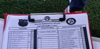 Sellitti col 3-5-2 standard cerca la reazione immediata ma in realtà il resto del primo tempo per il taccuino segnalerà sopratutto cose sangiorgesi, in particolare con il colpo di testa Botta e la conclusione di Liguori, che chiamano ai riflessi pronti l’esperto portiere avversario Benevento, che pure sul rigore s’era mosso bene. L’Alfaterna un pallone lo butta pure dentro, di testa con Rizzo, sugli sviluppi di corner di Mario Somma, ma la bandierina dell’assistente era ampiamente alzata in anticipo, pallone già con traiettoria fuori sulla battuta. Poco accade nella ripresa, fatta eccezione per una chance capitata a Barbarisi, ben contenuta da Benevento, per un paio di incursioni sempre pericolose di Liguori, un tentativo di Malafronte e una punizione dalla lunghissima distanza di Della Femina, tenuta a bada da Faggiano. Accade molto, invece, a livello di cartellini, tutti a carico dell’Alfaterna. Espulsione in campo per Mario Somma ed in panchina per mister Sellitti e il già sostituito Della Femina.