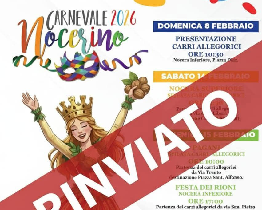 Nello specifico, sono state annullate le seguenti uscite: sabato pomeriggio: sfilata prevista nel comune di Nocera Superiore. Domenica mattina: appuntamento programmato nelle strade di Pagani. Al momento non sono state ancora comunicate le nuove date per il recupero degli eventi. Gli organizzatori hanno invitato la cittadinanza a monitorare i canali social e i siti istituzionali per restare aggiornati sulle prossime decisioni e sui nuovi orari delle sfilate.