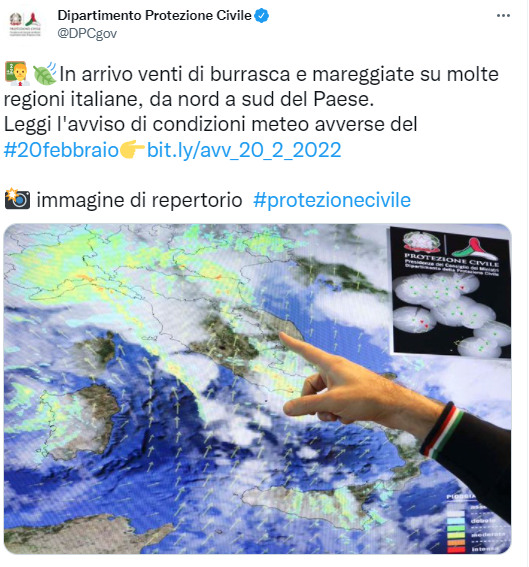 La fase di maltempo sarà accompagnata da un marcato rinforzo della ventilazione dai quadranti occidentali su tutto il Paese. Sulla base delle previsioni disponibili, il Dipartimento della Protezione Civile ha emesso un avviso di condizioni meteorologiche avverse.