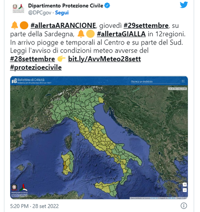 Allerta arancione per rischio idrogeologico sul settore centro-occidentale della Sardegna; gialla in Umbria, Lazio, Abruzzo, Molise, Toscana, Marche, Campania, Sicilia, Friuli Venezia Giulia, Basilicata e Calabria.