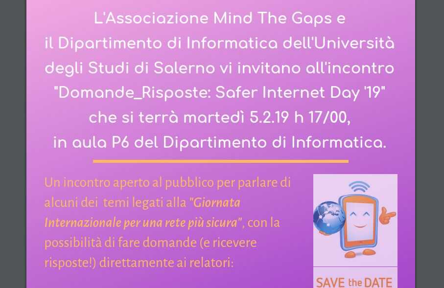 Domani alle ore 17.00 in aula P6 del Dipartimento di Informatica UNISA, l’associazione Mind The Gaps e il Dipartimento di Informatica presentano “Domande_Risposte/1 – Safer Internet Day 2019”.