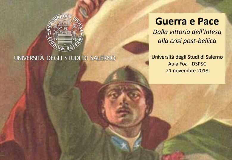 In occasione delle commemorazioni per il Centenario della Grande Guerra, il 21 novembre alle ore 10.30, presso l’Aula Foa del DSPSC dell’Unisa, avrà luogo il Convegno Guerra e Pace, dalla vittoria dell’Intesa alla crisi post-bellica.Promosso e organizzato dal Comitato per il Centenario di Salerno, il convegno intende tracciare le linee di politica interna ed estera, nonché quelle economiche e militari, che hanno caratterizzato il periodo che va dalle ultime fasi della guerra alle prime conferenze sul disarmo. È questa una prospettiva che va oltre l’analisi dell’ultimo anno di guerra per delineare i nuovi assetti geopolitici euro-mediterranei e mondiali.