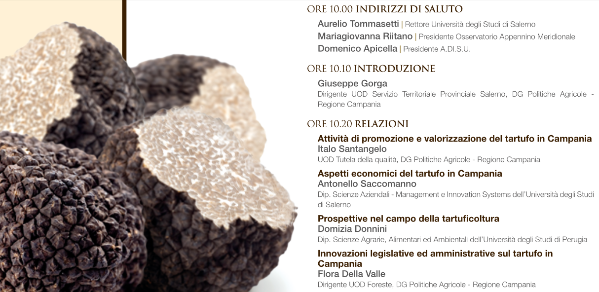 Si terrà domani, giovedì 24 novembre, dalle ore 10:00 presso il Salone delle Residenze Universitarie di Fisciano, il convegno dal titolo “Il tartufo in Campania tra valorizzazione del prodotto ed innovazioni normative” dedicato ad una delle prelibatezze del nostro territorio. A margine del convegno è prevista un’esposizione di tartufi, funghi ed altri sottoprodotti a cura delle associazioni dei tartufai della Provincia di Salerno, seguita da una degustazione di pietanze a base di tartufo realizzate da un Istituto Alberghiero della provincia di Salerno.