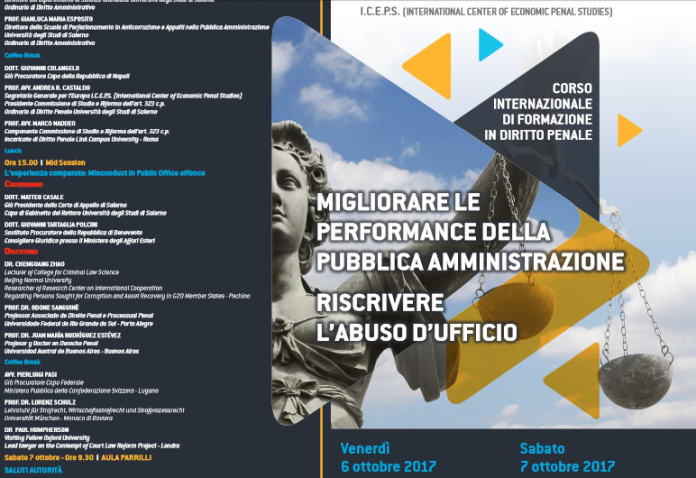 Il 6 e 7 ottobre presso l’aula Cilento dell’Unisa e l’aula Parrilli del Palazzo di Giustizia di Salerno, si terrà il Corso Internazionale “Migliorare le performance della Pubblica Amministrazione. Riscrivere l’abuso d’ufficio”, organizzato dalle cattedre di Diritto Penale e Diritto Penale Parte Speciale del Professore Andrea R. Castaldo in collaborazione con il Dipartimento di Scienze Giuridiche dell’Università degli Studi di Salerno, la Fondazione Universitaria dell’Ateneo salernitano, la Scuola di Perfezionamento in Anticorruzione e Appalti nella Pubblica Amministrazione, il Consiglio dell’Ordine degli Avvocati di Salerno, l’Osservatorio Giuridico sulla Criminalità Economica e l’International Center of Economic Penal Studies.