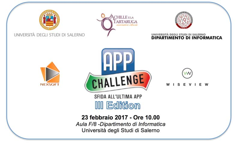 Si terrà giovedì la terza edizione di App Challenge-Sfida all’ultima App. Dopo il successo delle prime due edizioni, il Dipartimento di Informatica, con il patrocinio delle aziende Nexsoft, Wiseview e dell’associazione Achille e La Tartaruga, ripropone la competizione ideata per premiare il miglior progetto di sviluppo di App Enterprise e far emergere le competenze acquisite dagli studenti durante il proprio corso di studi. La competizione si terrà alle ore 10.00 presso l’aula F/8 del Dipartimento di Informatica dell’Università di Salerno.