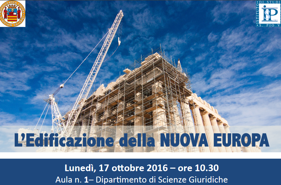 Lunedì 17 ottobre, alle ore 10.30, presso l’Aula 1 del Dipartimento di Scienze Giuridiche si terrà l’incontro tematico dal titolo “L’Edificazione della Nuova Europa”. Aperto dai saluti istituzionali del Rettore Aurelio Tommasetti e del Direttore del Dipartimento di Scienze Giuridiche Sergio Perongini, l’incontro ospiterà l’intervento di Francescomaria Tuccillo, autore del saggio “L’Edificazione della Nuova Europa”.