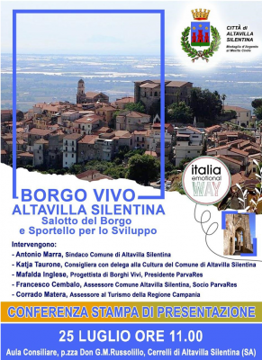 Sabato 25 Luglio alle 11,00 presso l’Aula Consiliare in Cerrelli di Altavilla Silentina (SA), il Sindaco Antonio Marra, con l’Assessore Francesco Cembalo e la Consigliera Delegata alla Cultura Katja Taurone, presentano BORGO VIVO DI ALTAVILLA SILENTINA, nell’ambito del progetto di rete BORGHI VIVI, ideato dal Movimento sociale e culturale ITALIA EMOTIONAL WAY