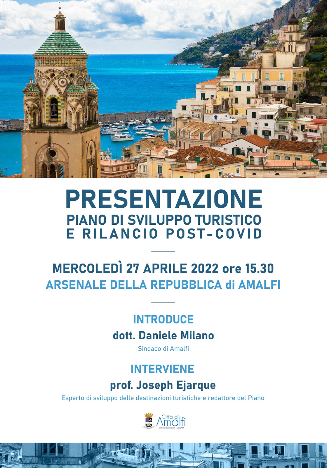 La presentazione del Piano si terrà mercoledì 27 aprile alle ore 15:30, presso l’Arsenale della Repubblica di Amalfi. Interverrà il redattore del Piano prof. Josep Ejarque (FTourism & Marketing), uno dei massimi esperti del Destination Marketing e Destination Management internazionale in Italia.