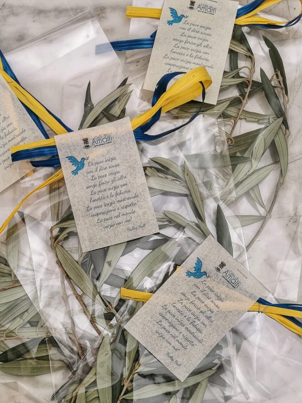 A spiegare l’iniziativa direttamente ai piccoli allievi di Amalfi e Pogerola l’assessore alla Cultura Enza Cobalto e l’assessore alle Politiche Sociali Francesca Gargano. Ai bimbi dell’istituto comprensivo di Amalfi, della scuola paritaria “Mariano Bianco”, al micro nido comunale e al centro diurno per disabili adulti, sono state distribuiti delle palme di ulivo, decorate con i nastrini con i colori dell’Ucraina, accompagnate dalla pergamena che riporta la poesia scritta da una bambina americana Halley Hall, dal titolo “Dove inizia la pace”: «La pace inizia con il dire scusa. La pace inizia senza ferire gli altri. La pace inizia con l’onestà e la fiducia. La pace inizia mostrando cooperazione e rispetto. La pace nel mondo inizia con me».