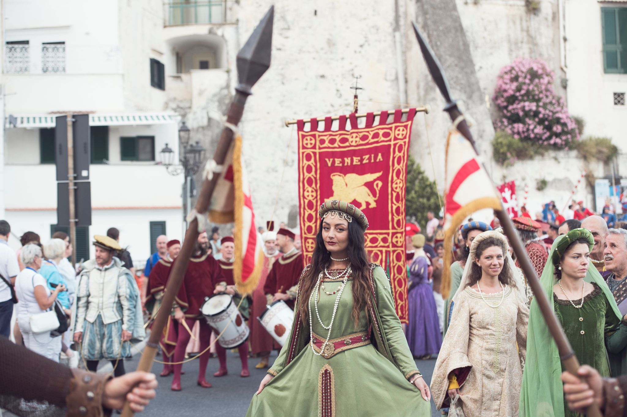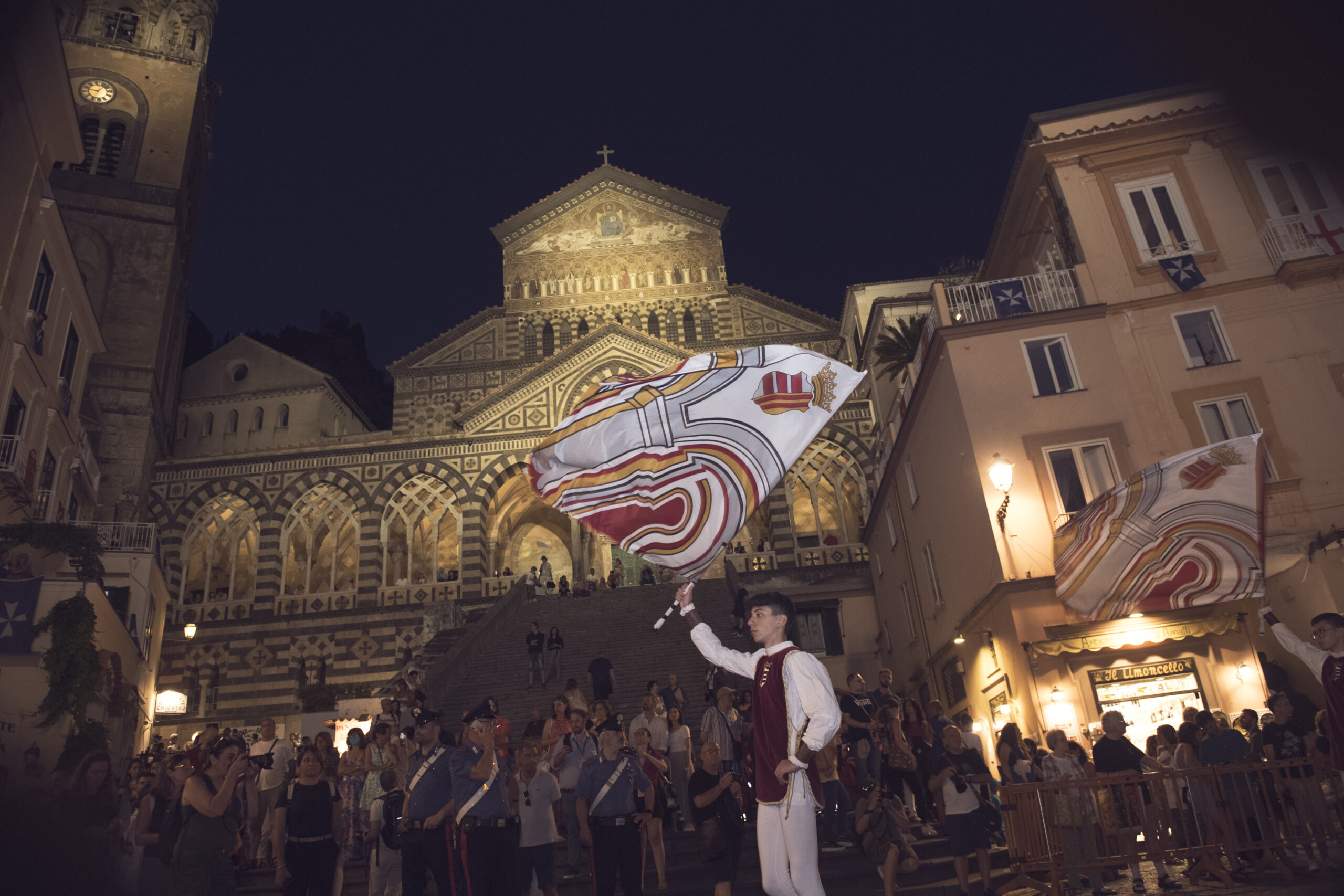 Il momento più suggestivo arriva all’imbrunire: il Corteo Storico al calar del sole restituisce alla platea di spettatori emozioni uniche, palpabili nei colori del borgo di Atrani e nella scalinata del Duomo di Amalfi, nei costumi degli oltre 320 figuranti (80 per Repubblica) e nei mille flash che hanno immortalato la rievocazione storica.