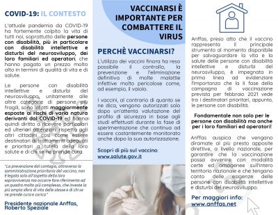 Per questo motivo, Anffas vuole impegnarsi affinché sia evidenziata l’importanza che la vaccinazione ha in primis per la vita stessa delle persone con disabilità intellettive e disturbi del neurosviluppo ma anche per i loro familiari ed operatori che avendo un contatto stretto e quotidiano con le prime hanno bisogno anch’esse di essere tutelate.