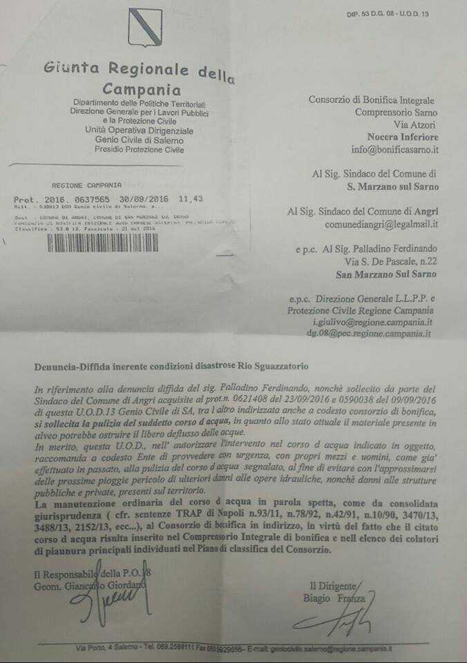 Con due ordinanze l’amministrazione comunale di Angri ha ottenuto che il Consorzio di bonifica affidasse a ditte specializzate la rimozione dei materiali dragati e depositati lungo il canale Rio Sguazzatorio, in seguito alle esondazioni dello scorso ottobre. “Dopo le nostre sollecitazioni e la denuncia-diffida di un cittadino  – spiega il sindaco Cosimo Ferraioli – anche la Regione, richiamando alcune sentenze del tribunale regionale per le acque pubbliche, ha stabilito che la pulizia e la manutenzione del canale compete al Consorzio di bonifica, al quale il 10 ottobre abbiamo ordinato di nuovo la rimozione dei detriti. In caso contrario procederemo in danno all’ente consortile”26