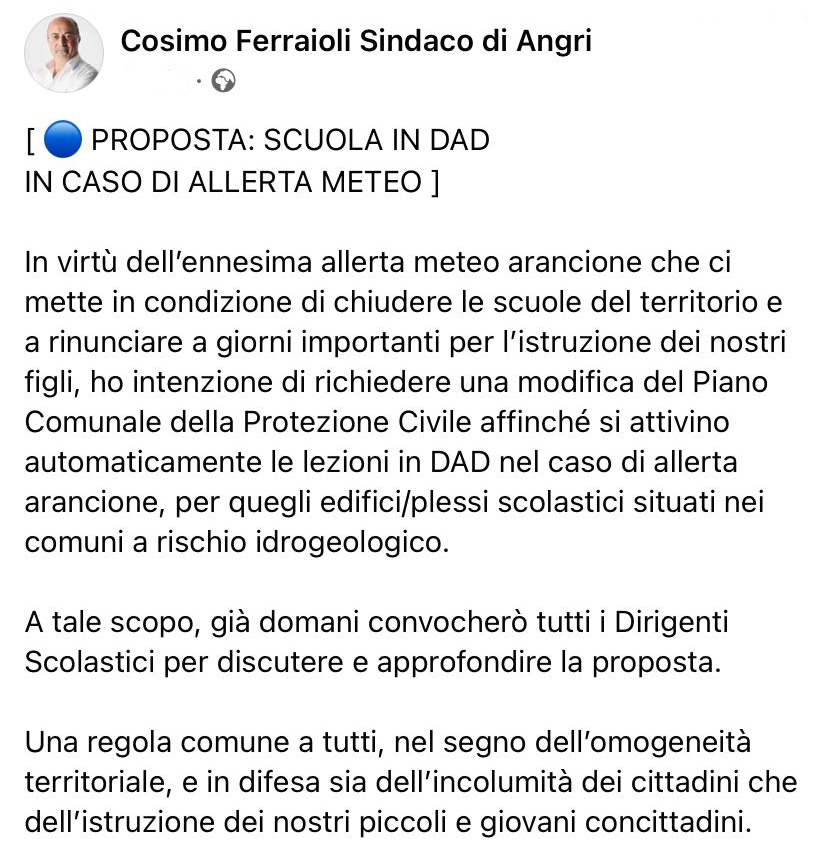 In virtù dell’ennesima allerta meteo arancione che ci mette in condizione di chiudere le scuole del territorio e a rinunciare a giorni importanti per l’istruzione dei nostri figli, ho intenzione di richiedere una modifica del Piano Comunale della Protezione Civile affinché si attivino automaticamente le lezioni in DAD nel caso di allerta arancione, per quegli edifici/plessi scolastici situati nei comuni a rischio idrogeologico.
