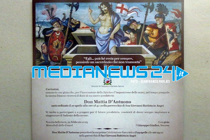 Il giovane don Mattia D’ Antuono il 29 nella parrocchia di San Giovanni Battista in Angri, pronuncerà la sua solenne prima Messa. Don Mattia in questi anni si è fatto amare anche da chi è lontano dalle cose di chiesa, poiché egli ha sempre saputo guardare oltre la fede, come i valori della famiglia, dove ha coltivato la prima educazione alla fede, ma è stato soprattutto nella Collegiata di san Giovanni Battista accanto al compianto don Alfonso Raiola e successivamente a don Enzo Leopoldo che ha potuto instaurare un’intensa esperienza di fede, prima come ragazzo dell’oratorio e poi come animatore ed educatore proprio nella chiesa madre di San Giovanni Battista.