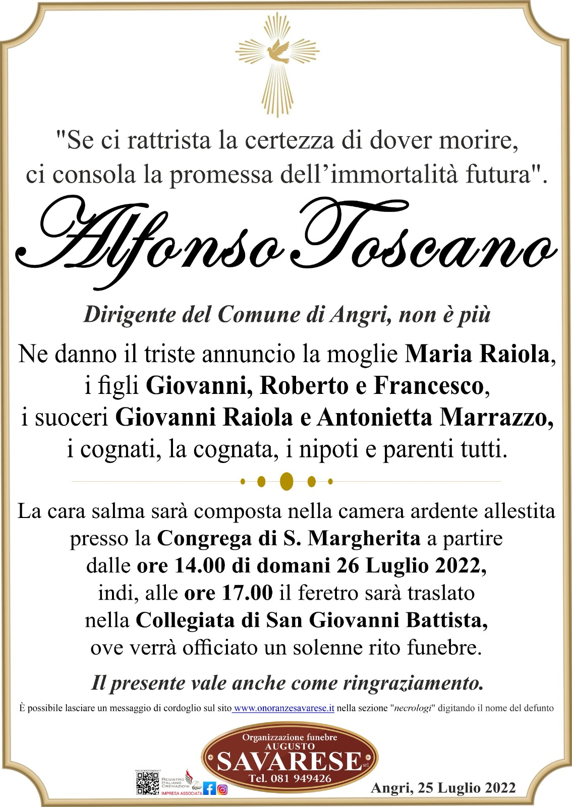 Si è spento nell’ospedale di Sarno dopo una breve malattia Alfonso Toscano, per uno scherzo del destino a poche ore dalla dipartita di Giuseppe Iovane architetto ex assessore e consigliere comunale, è un misto di dolore e di rabbia per una malattia che in pochi mesi ti strappa alla vita in così breve tempo, ora la città è pronta ad affrontare un’altra grave perdita.