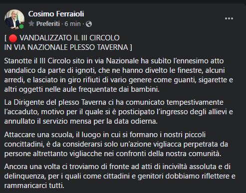 E’ stato il primo cittadino a dare l’annuncio attraverso la sua pagina social dell’episodi di questa notte al III Circolo sito in via Nazionale che ha subìto l’ennesimo atto vandalico da parte di ignoti.