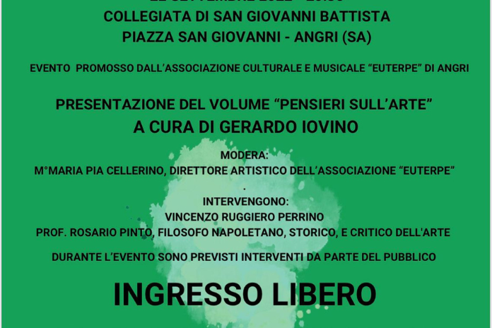 Inserito nel cartellone degli eventi autunnali dell’Associazione Culturale e Musicale “Euterpe” di Angri, l’incontro con l’autore sarà moderato dal Direttore Artistico dell’associazione, M^ Maria Pia Cellerino cui si alterneranno gli interventi del giornalista Vincenzo Ruggiero Perrino e del Critico d’arte Rosario Pinto.