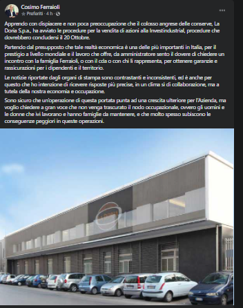 Apprendo con dispiacere e non poca preoccupazione che il colosso angrese delle conserve, La Doria S.p.a., ha avviato le procedure per la vendita di azioni alla Investindustrial, procedure che dovrebbero concludersi il 20 Ottobre.