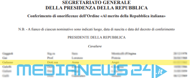 L’attestato porta in calce le firme del Presidente della Repubblica Sergio Mattarella e del Capo del Governo Mario Draghi, ed è un riconoscimento che premia la piena abnegazione al ruolo di ufficiale pubblico che riveste il Comandante Anna Galasso, che da ieri è neo Cavaliere dell’Ordine al merito della Repubblica Italiana.