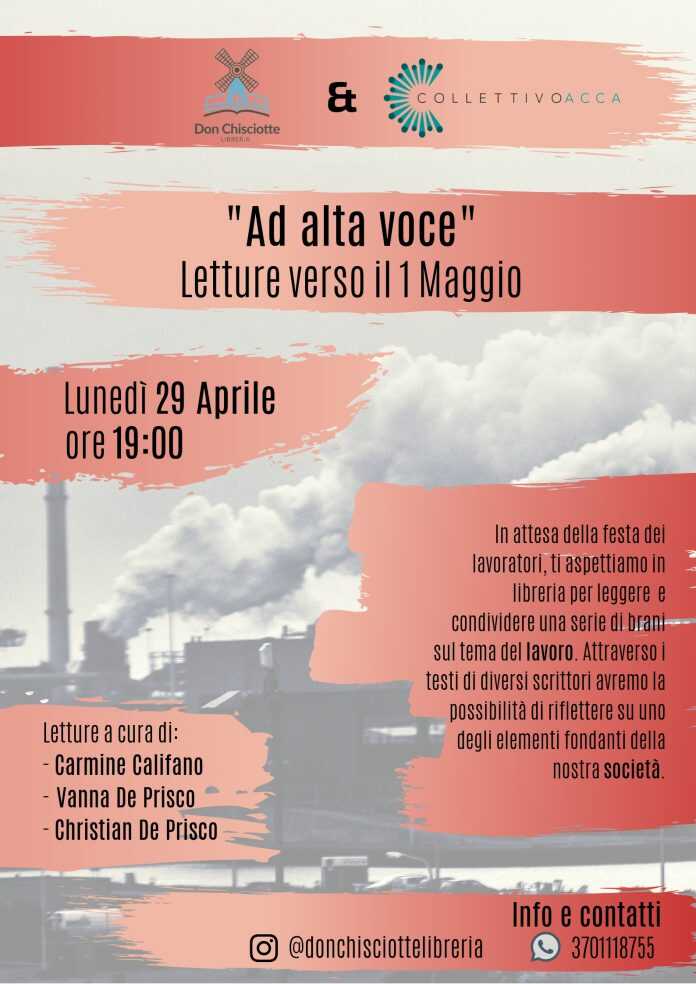 Lunedì 29 Aprile alle ore 19:00, presso la libreria Don Chisciotte di Angri, si terrà una lettura pubblica sul tema del lavoro.L’incontro, organizzato con la fondamentale collaborazione del Collettivo Acca teatro, guidato da Carmine Califano, prevede la lettura di testi di diverso genere e dal taglio variegato. Brani dal carattere più letterario ne accompagneranno altri dal tono più documentaristico e giornalistico.