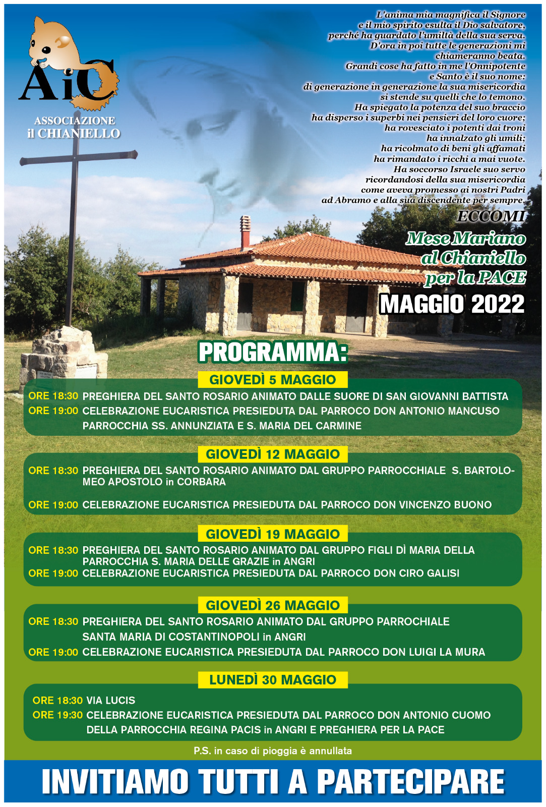 È tradizione, in questo mese, da anni che l’associazione si proodica ad organizzare e pregare il Rosario al Chianiello, in famiglia con amici e parenti in una dimensione che le restrizioni della pandemia ci ha ‘costretto’ a farne a meno con una grande affluenza, per circa due anni anche dal punto di vista spirituale. Insomma un buon motivo di ispirazione alla preghiera e di speranza di pace che gli Amici del Chianiello apre il mese di Maggio.