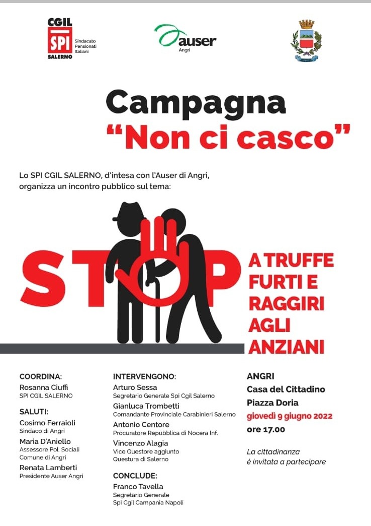 La campagna di sensibilizzazione “Non ci casco”- organizzata da SPI CGIL Salerno, d’intesa con l’Auser di Angri – darà vita ad un incontro pubblico che avrà luogo giovedì 9 giugno 2022 alle ore 17,00 presso la Casa del Cittadino in Piazza Doria- Angri per discutere di una problematica così seria ed importante come le truffe a danni degli anziani.