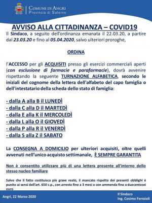 L’ordinanza in vigore da domani, in ordine alfabetico, sarò il uovo sistema, di come si procede alla spesa settimanale nel territorio di Angri