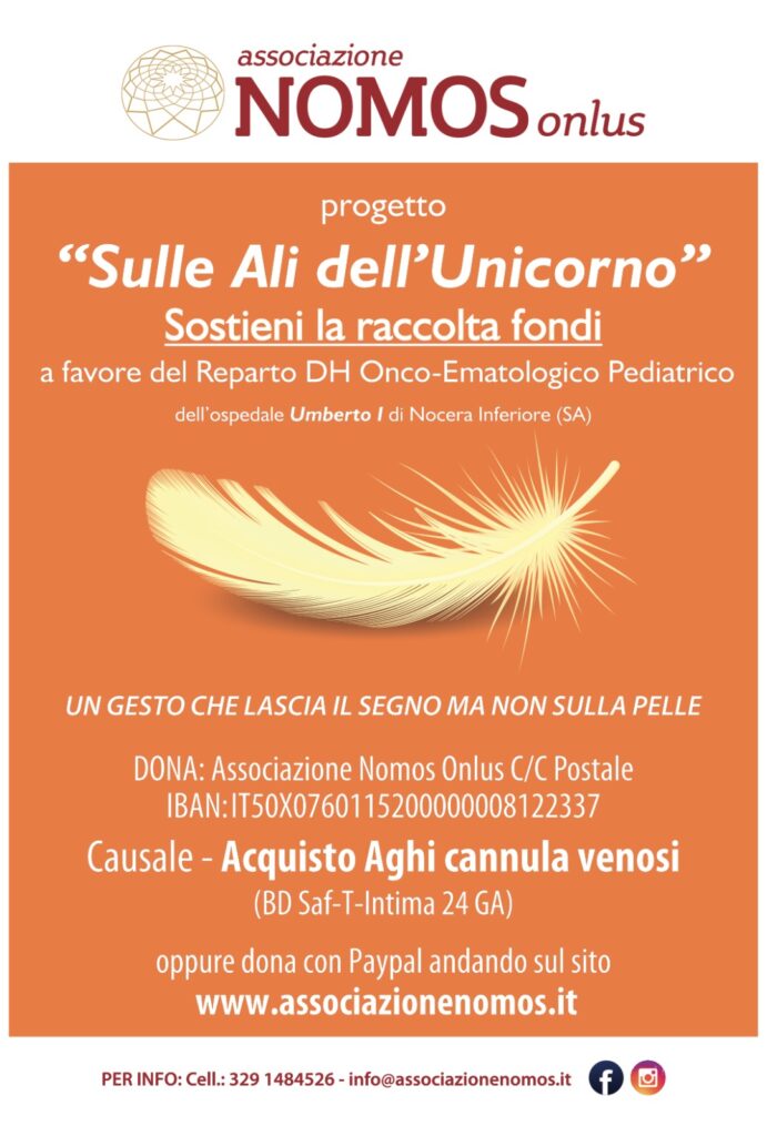 L’Associazione Nomos Onlus, lancia una raccolta fondi per l’acquisto di Aghi cannula venosi (BD Saf-T-Intima 24 GA), per il reparto DH Onco-Ematologico Pediatrico dell’Ospedale Umberto I DI Nocera Inferiore.