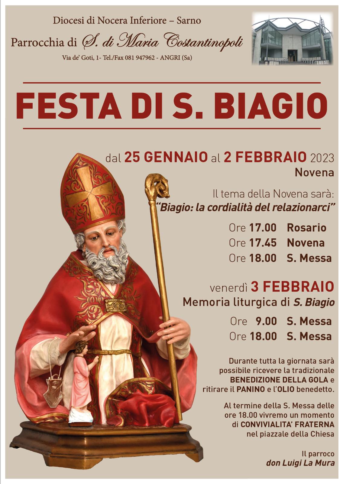 Anche quest’anno nella chiesa di Santa Maria di Costantinopoli, si svolgerà il rito di Benedizione della Gola, ad officiare ci saranno Don Luigi La Mura e don Alfonso Giordano.